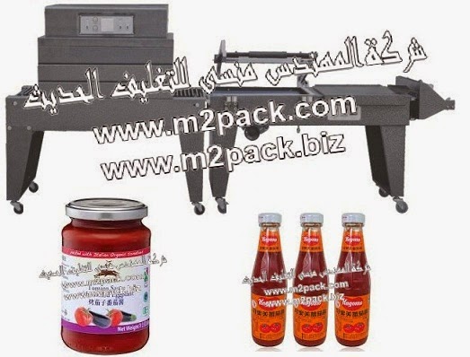 ماكينة تغليف زجاجات الكاتشاب بفيلم الشرنك الحراري مع ماكينة اللحام والقطع شكل Lنصف اتوماتيكية موديل 108 النموزجية إم تو باك :